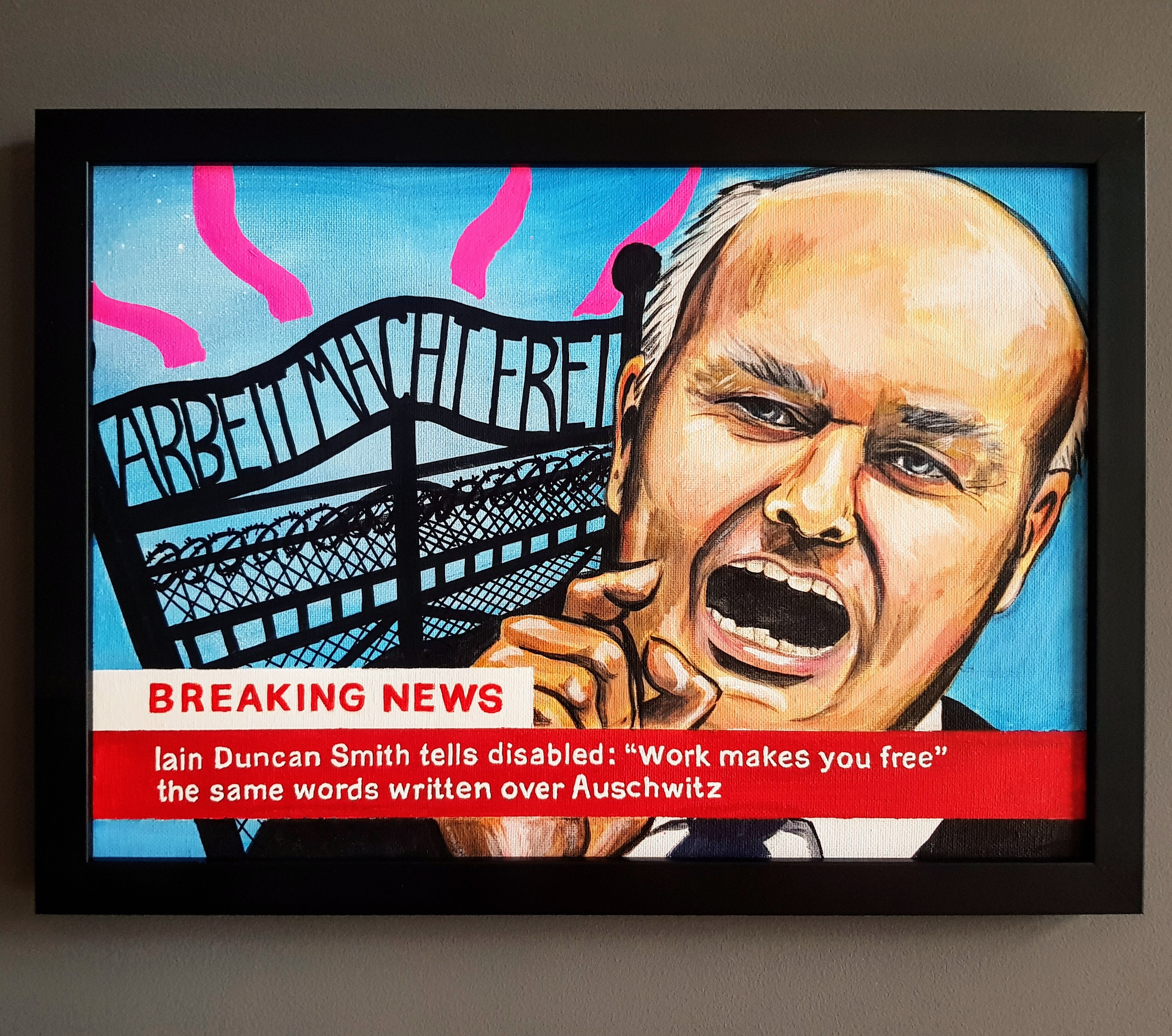 The ‘icon’ in my painting was MP Iain Duncan Smith (IDS) as he is noted for imposing the most inhumane disability reforms in U.K history. In an interviews when asked about his harsh reforms he replied: “WORK MAKES YOU FREE”- the very words written over the Nazi concentration camps.