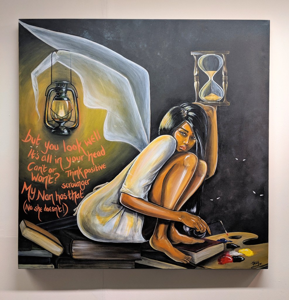 Such vibrant, poignant, emotive paintings came from myself, Mr J Art, Kirzart, Catherine, Drew Sinclair, Vane Mg and Baserbillion. Graffiti skills came courtesy of Name26, beautiful sculptures from Karla Cornwell and a stunning short film by director Greg Direct. The main piece I submitted was Memento Mori along with other works; Origin, Riri, Grenfell, After Dark and Not Your Inspiration. Each and every piece at Brown Jewels was created from the heart with deep meaning, often conveying the vulnerability of each artist’s personal experience and history.
