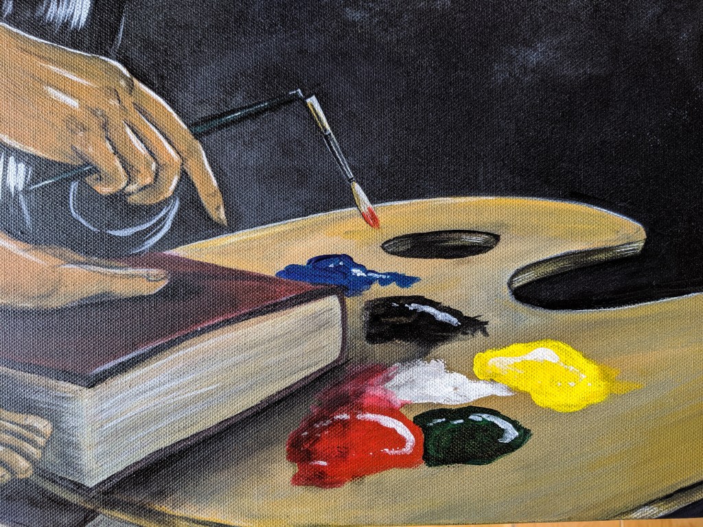 When one minority – race, collides with another – disability. “You need to study five times harder than your white friends (for equity)”, Jelly was told as a child, by parents who experienced racism in the UK. The pile of books on top of the artist pallete demonstrates the priority of education but also how art became a struggle with the onset of degenerative autoimmune illness, shown by the broken paintbrush. To parents who worked hard and were unfamiliar with UK welfare services, entering another minority: disability, meant inequality increased.