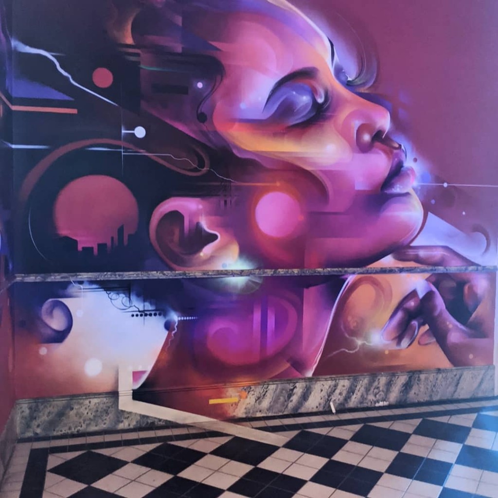 I was showed to the second floor which featured a collaboration room where visiting artists could submit artwork (and also could draw on the walls) I drew a piece as high as I could reach and submitted my New Horizons artwork which to my delight was printed and placed in the room, next to my artist friend work Agheras.