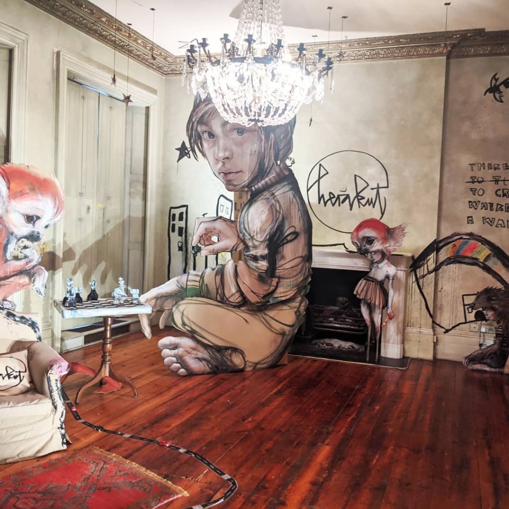 I have to say my favourite was the Herakut room. A true fantasy room! My heart skipped a beat these guys are amongst my favourite artists. The iconic big eyed characters were supersized and playing in the room. There was a very lucky school child who got to draw on the walls as part of the room aka a collaboration with Herakut.