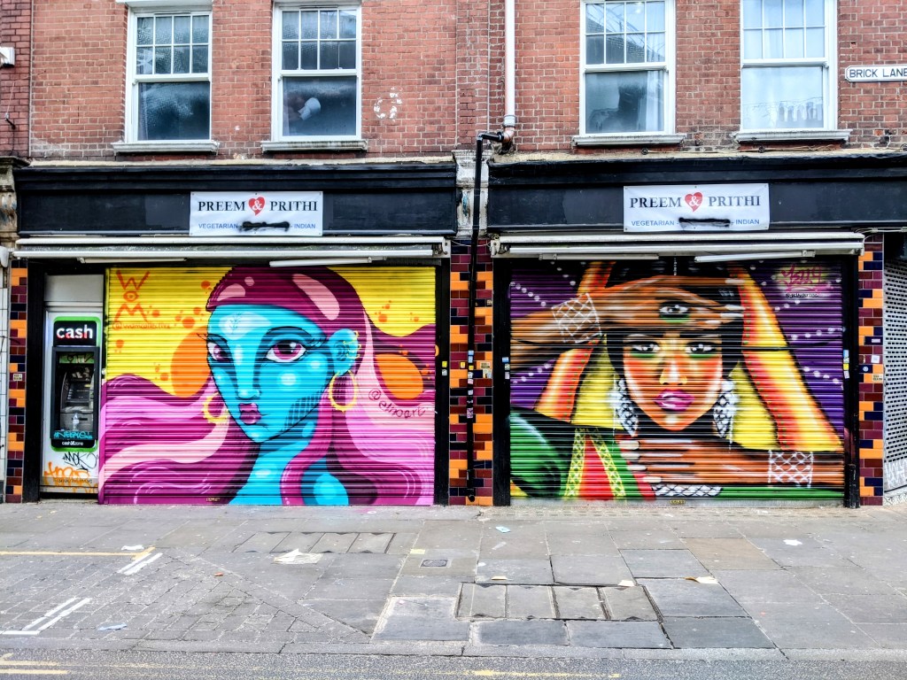 My first mural artwork of the year was to revive my Desi Girl in Brick Lane which is situated on the shutters of the old Dark Sugars chocolate shop on the corner of Brick Lane and Hanbury Street in the centre of Shoreditch. Originally painted with the WOM Collective organised by Carleen De Souza and Not Banksy Forum mine and Elno’s pieces were finally in need of a new year touch up. Elno did a completely new piece but I decided to update mine as the piece has been so popular and is a representation of the demographic of the area which is arguably being forced out due to gentrification of the area. The updated Desi Girl is more dynamic and colourful than before with a bright green sari and vibrant makeup